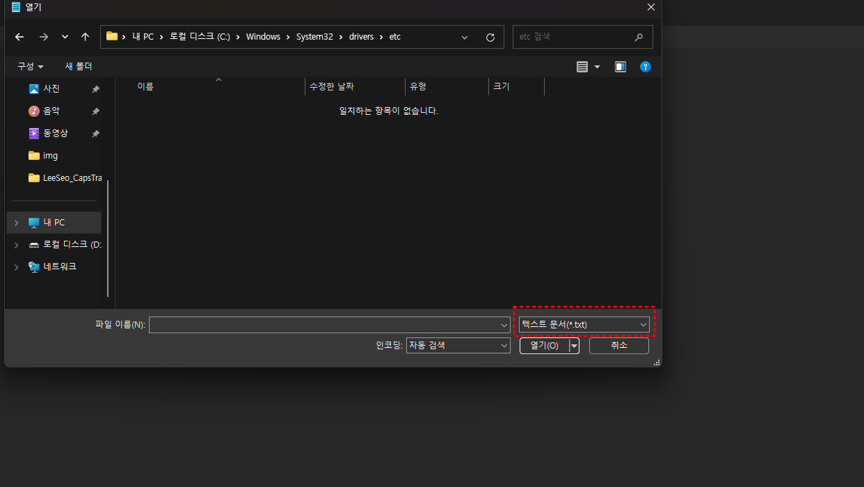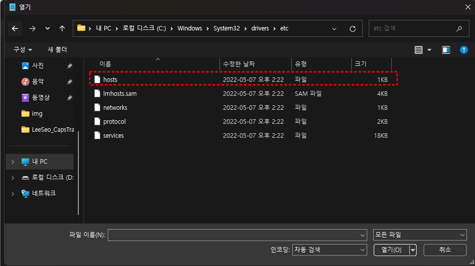 내 컴퓨터 -> 로컬디스크 C -> Windows -> System32 -> drivers -> etc