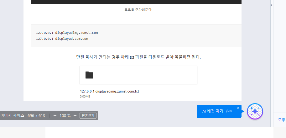 해당 호스트 파일에 알툴즈 관련 광고 도메인에 접속할 경우 자동으로 내 컴퓨터로 접속되게 하면 오류가 발생할것이다.