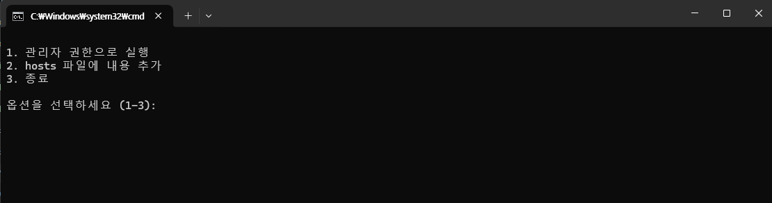 bat 파일을 다운로드 받아 실행하면 상단과 같이 출력되며 1번 입력후 관리자 권한 승인 한 다음에