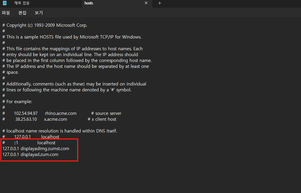 hosts 파일을 열어서 아래 코드를 추가해준다.
