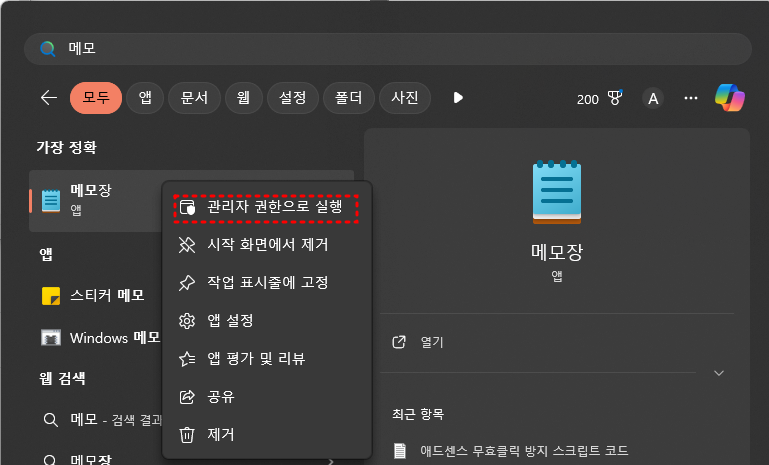 가장 먼저 메모장을 관리자 권한으로 열어준다.