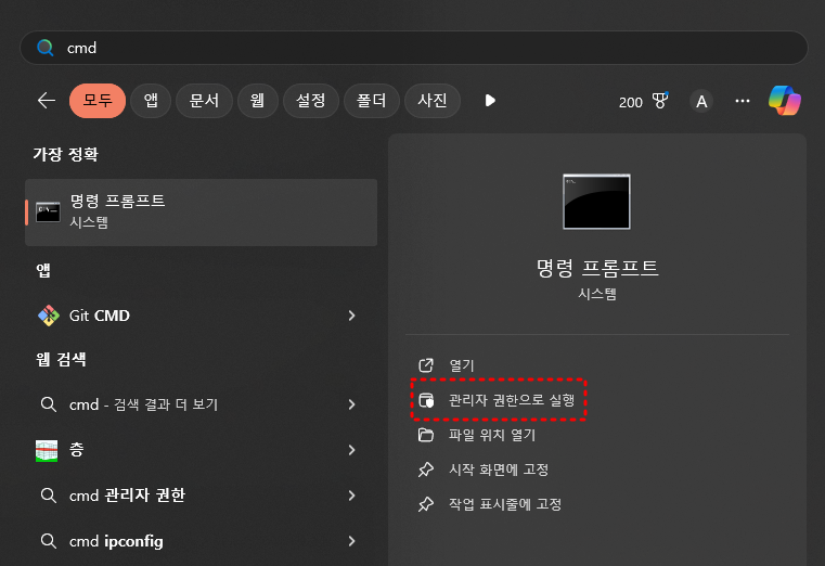 가장 먼저 cmd를 관리자 권한으로 실행을 합니다.