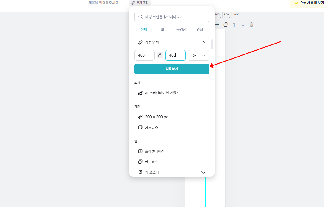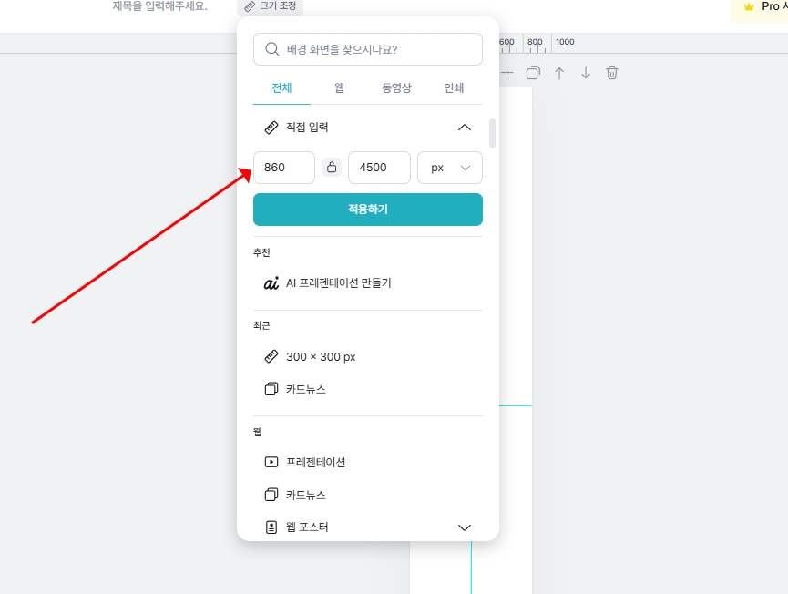 이미지 크기를 입력한 다음에 적용하기 버튼을 눌러 적용 해줍니다.