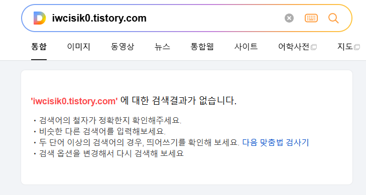 티스토리 주소를 검색해야된다. 본 티스토리 블로그 주소를 입력했지만 검색 결과가 없다.