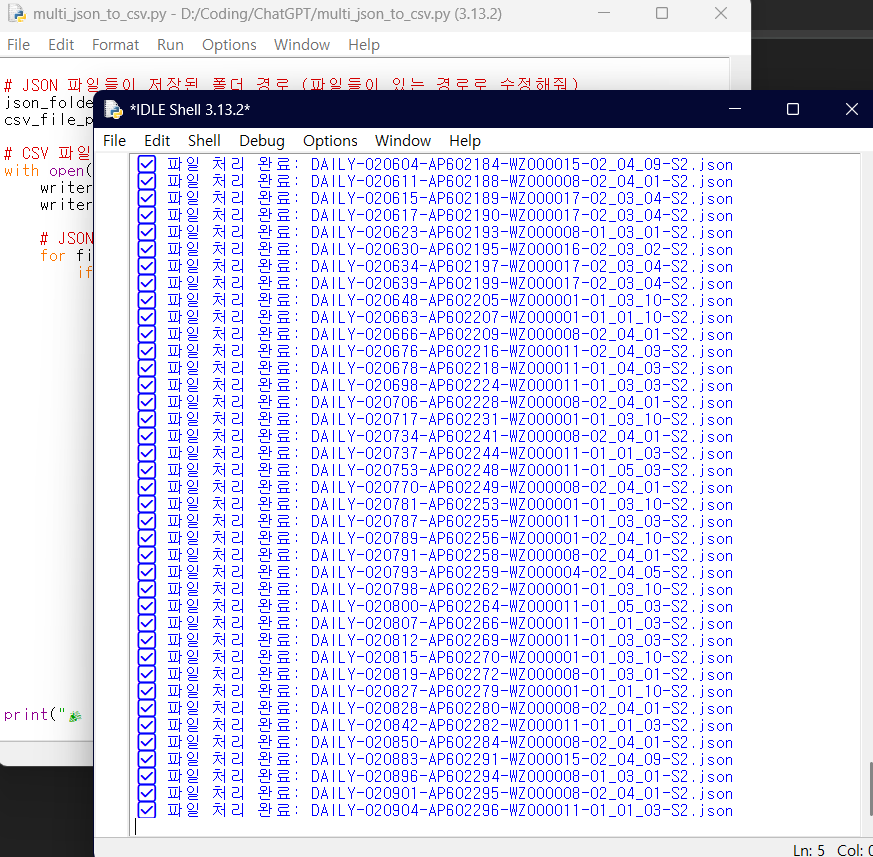 데이터를 다운받아 JSON 파일을 CSV로 변환하고 있다.