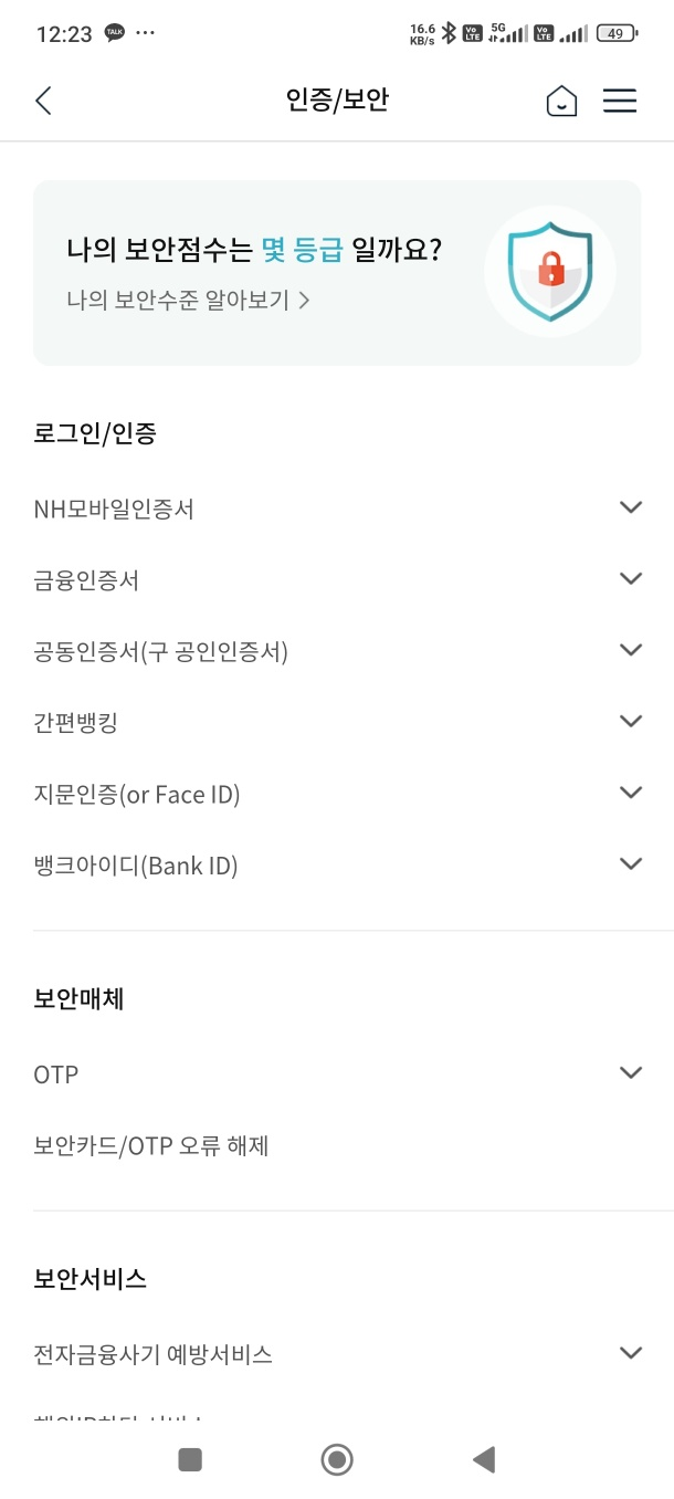 메뉴창을 열어준 다음에 인증/보안 메뉴를 눌러주면 우측 사진처럼 인증/보안 페이지로 이동됩니다.
