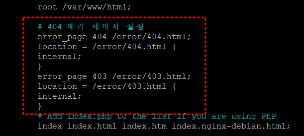 가장 먼저 에러페이지를 준비했다는 가정하에 nginx 설정파일을 열어 아래 내용을 추가한다.