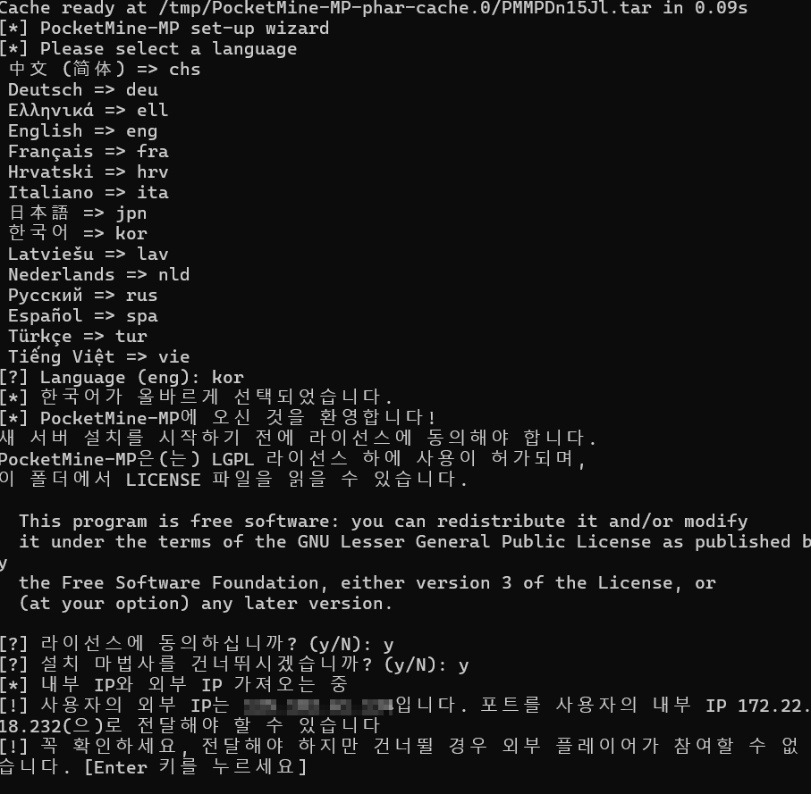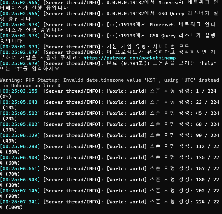 pmmp 라이센스 동의창이 나온다. 그냥 다 동의해준다음 기다리면 스폰 지형 생성이 진행된다.